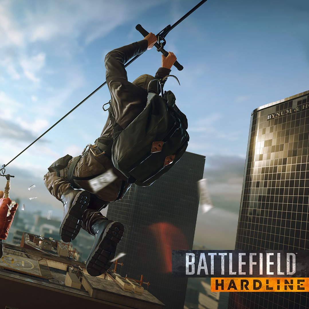 Dans Battlefield Hardline, la connaissance de l’environnement est indispensable pour remporter la victoire. Des objets sont judicieusement disposés sur les toits et les nacelles de laveurs de carreaux, et vous pouvez passer par les toits pour vous déplacer grâce aux tyroliennes. Sur un toit tout proche se trouve un hélicoptère qui permettra aux gangsters de sécuriser l’argent. Trouvez-le et utilisez-le en priorité ! Lorsque vous jouez les flics, une stratégie efficace consiste à protéger les points de fuite dès que les gangsters ont accédé aux stocks.